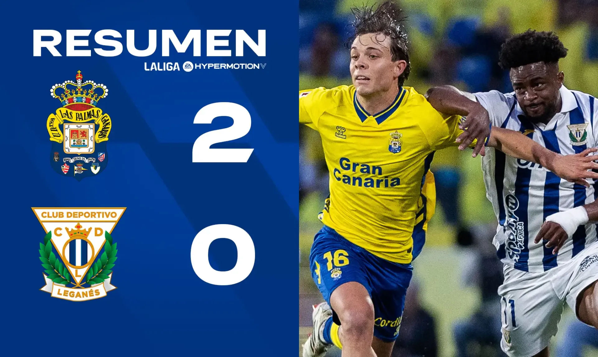 C.D. Leganés failed to pick up any points on their visit to Las Palmas (2-0) in a match corresponding to Matchday 36 of LALIGA HYPERMOTION. Estanis, in the first half, and Manu Fuster, in the second, scored the goals for the yellow-and-blue side.