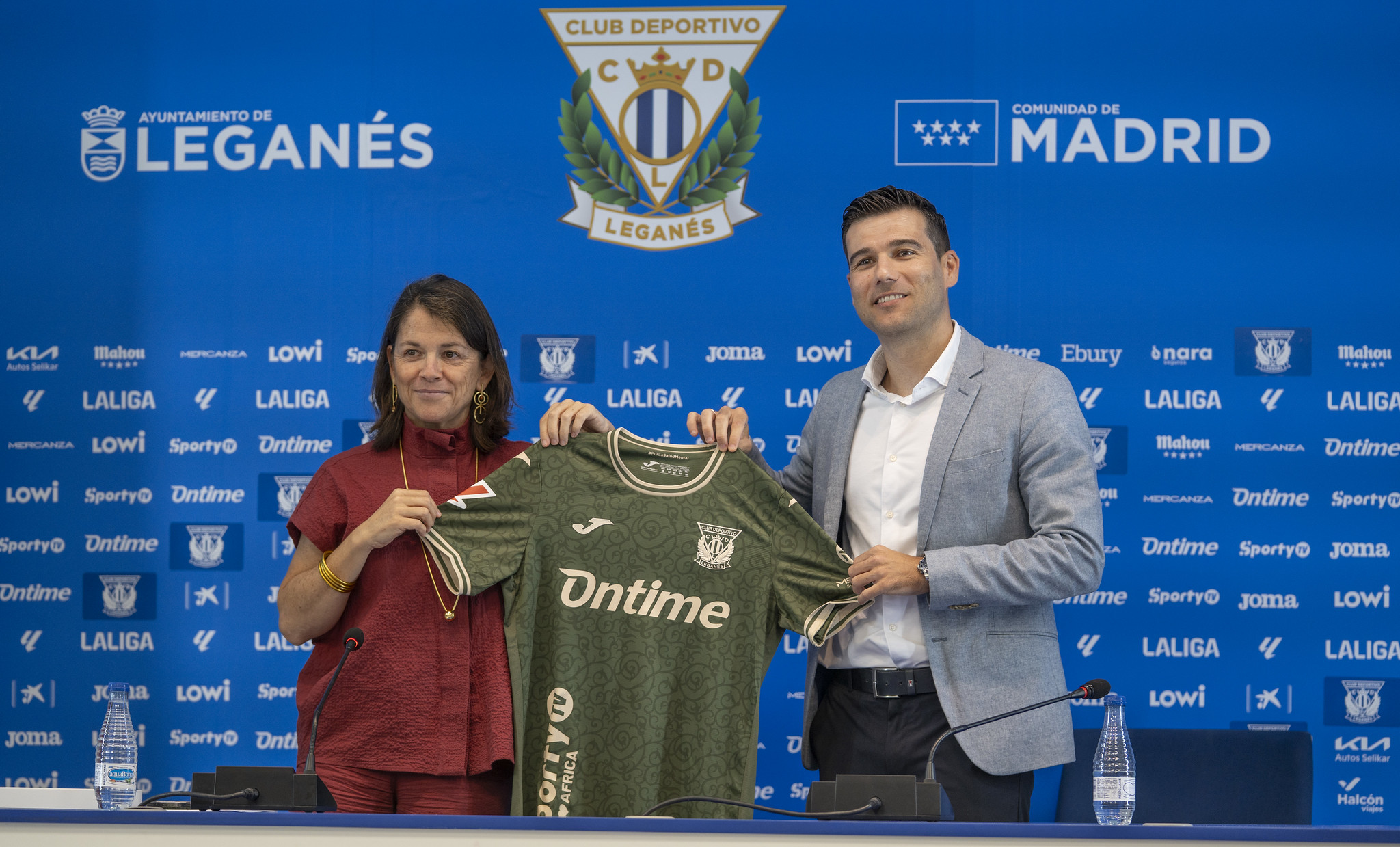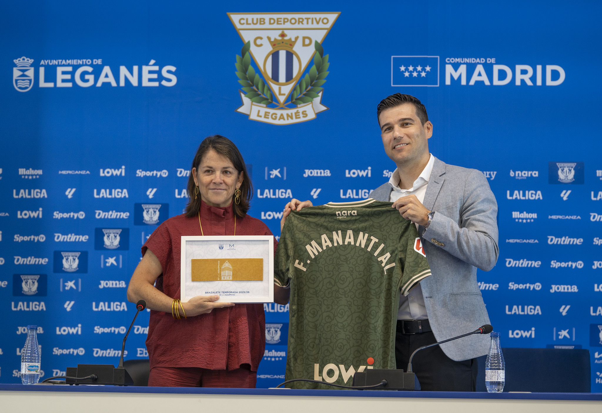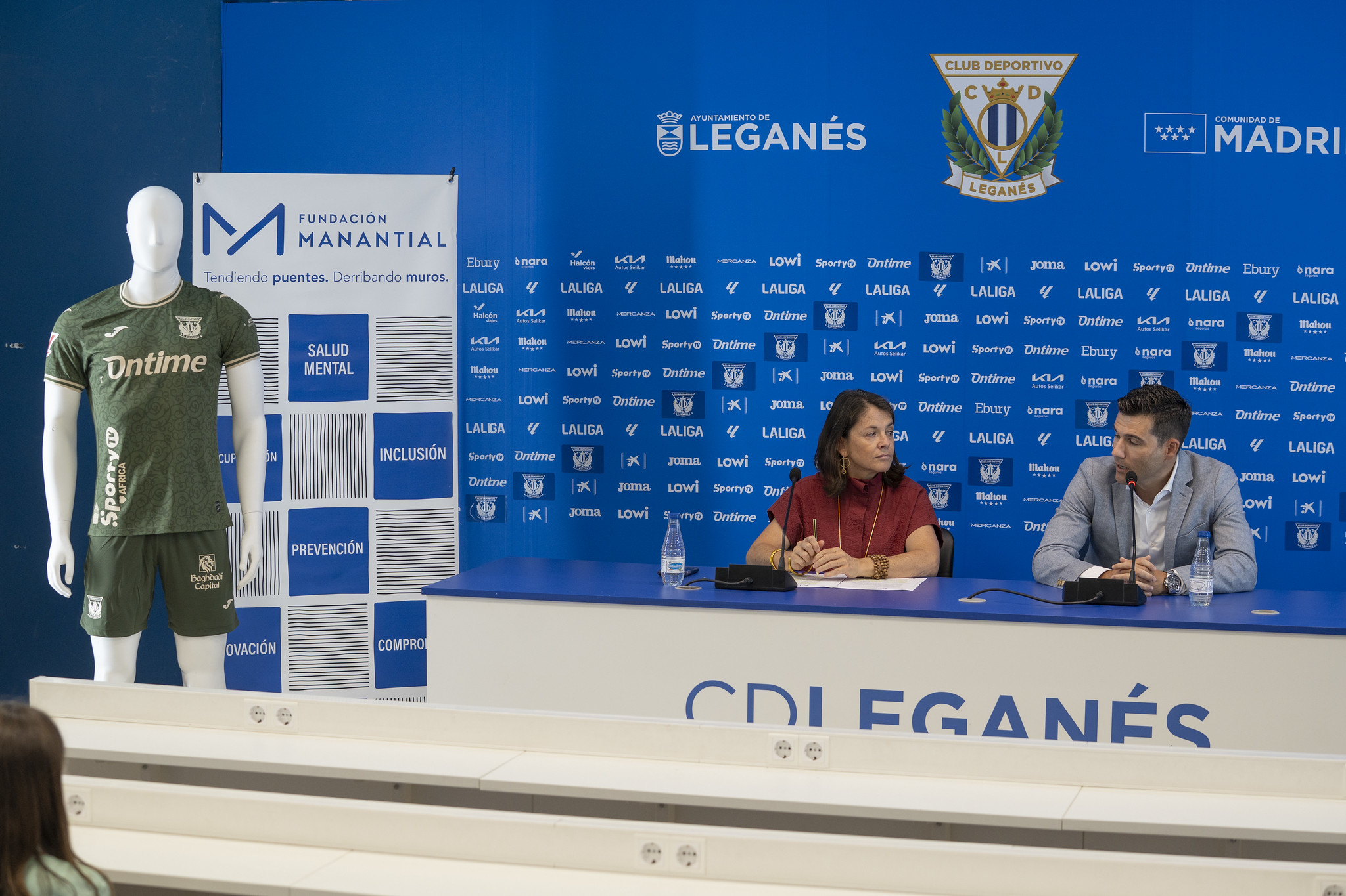 La nueva indumentaria pepinera fue presentada este martes en la sala de prensa del Estadio Butarque, en un acto que contó con la presencia del director general del club, Martín Ortega, y la directora general de Fundación Manantial, Elena Biurrún.