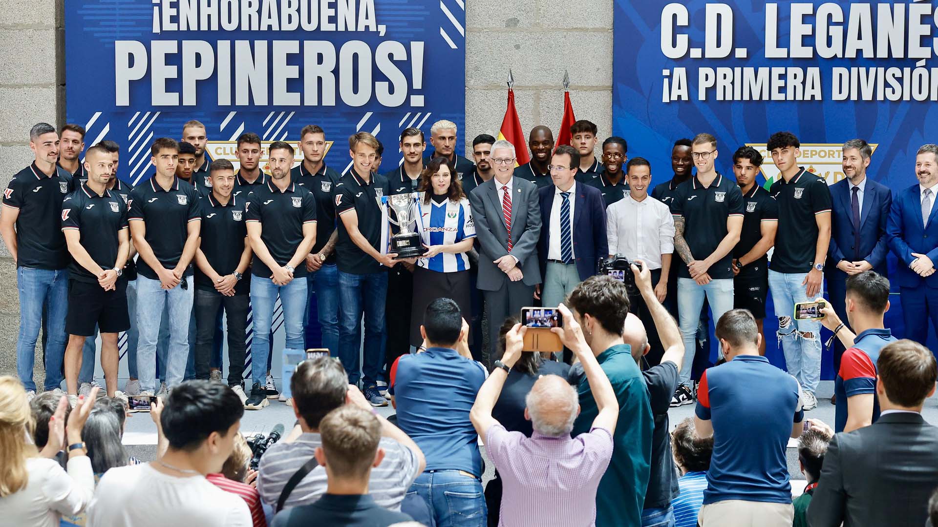 La plantilla, cuerpo técnico y staff del C.D. Leganés concluyó este martes los actos de celebración por el ascenso a Primera División con las visitas institucionales a la sede de la Comunidad de Madrid y la ofrenda floral a la virgen de Nuestra Señora de Butarque.