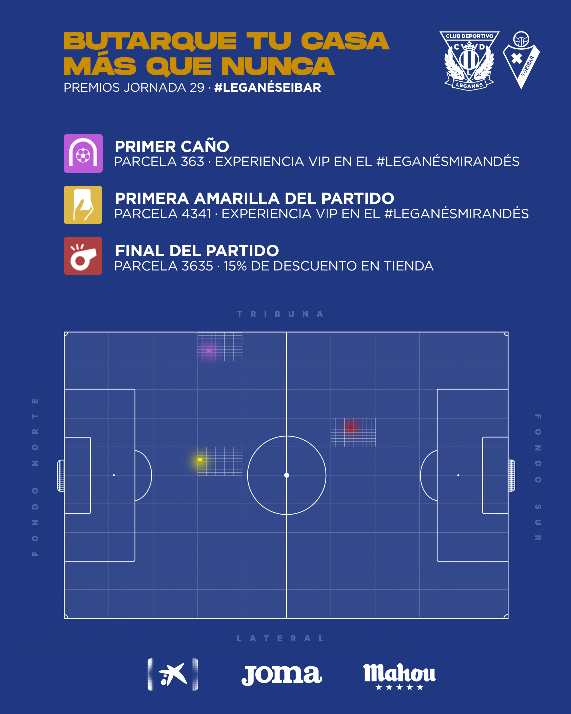 En esta jornada, se llevan dos experiencias VIP para nuestro próximo partido en casa los propietarios de las parcelas 363, donde se produjo el primer caño del partido, y 4341, en la que se mostró la primera tarjeta amarilla del encuentro. Además, la parcela 3635, en la que se señalizó el final del partido, se lleva un 15% de descuento en la tienda oficial del club.