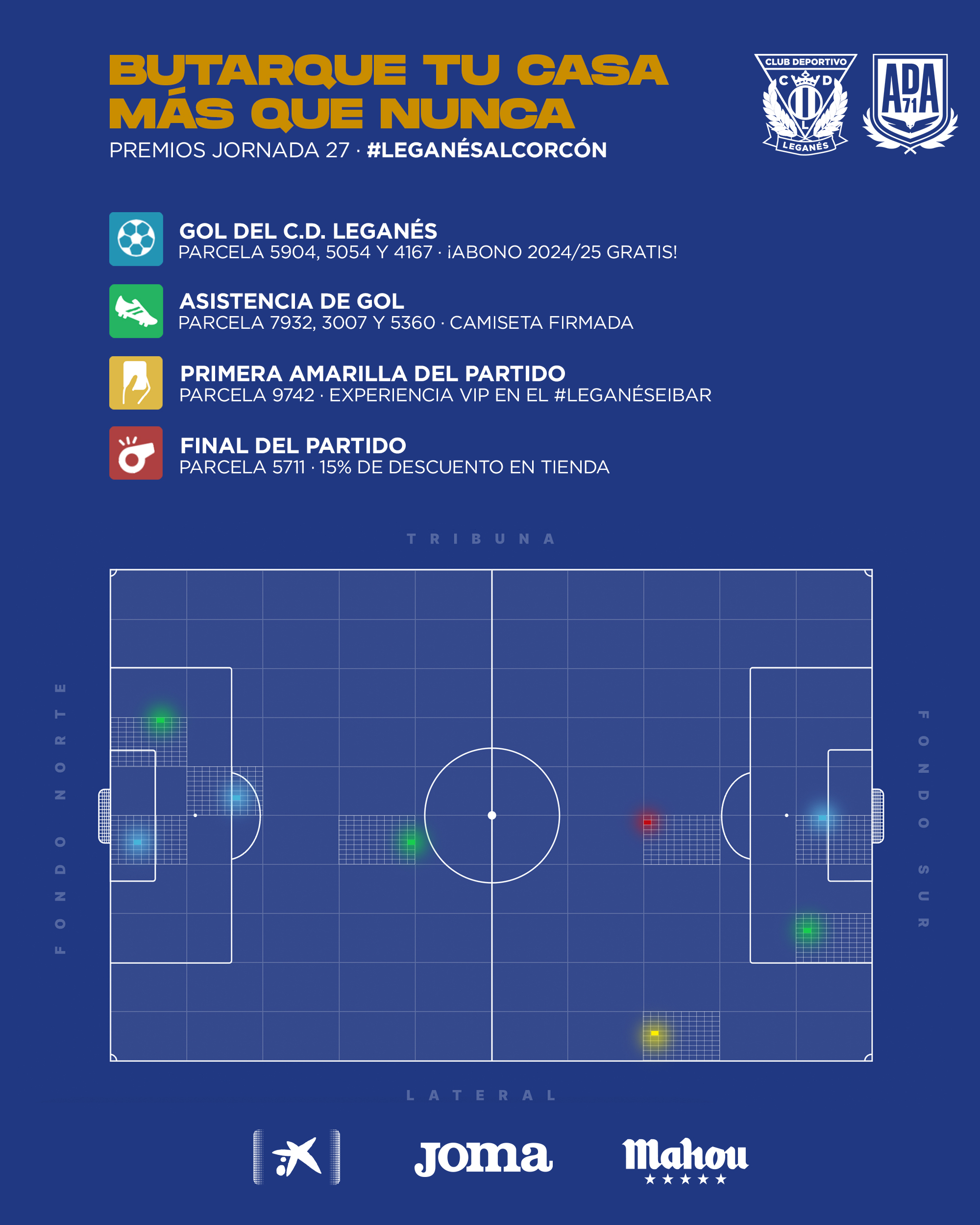 Una experiencia VIP para el próximo partido en Butarque se lleva el propietario de las parcelas 9742, donde se mostró la primera tarjeta amarilla del encuentro. Por último, la parcela 5711, en la que se señalizó el final del partido, se lleva un 15% de descuento en la tienda oficial del club.