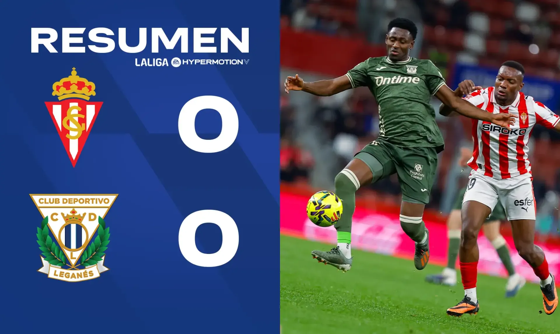 El C.D. Leganés sumó un punto en su visita al Real Sporting (0-0). El choque, reanudado este lunes tras ser suspendido por el fallecimiento de un aficionado local el domingo, finalizó sin goles tras un disputado encuentro, en el que el Lega no encontró ocasiones claras de gol.